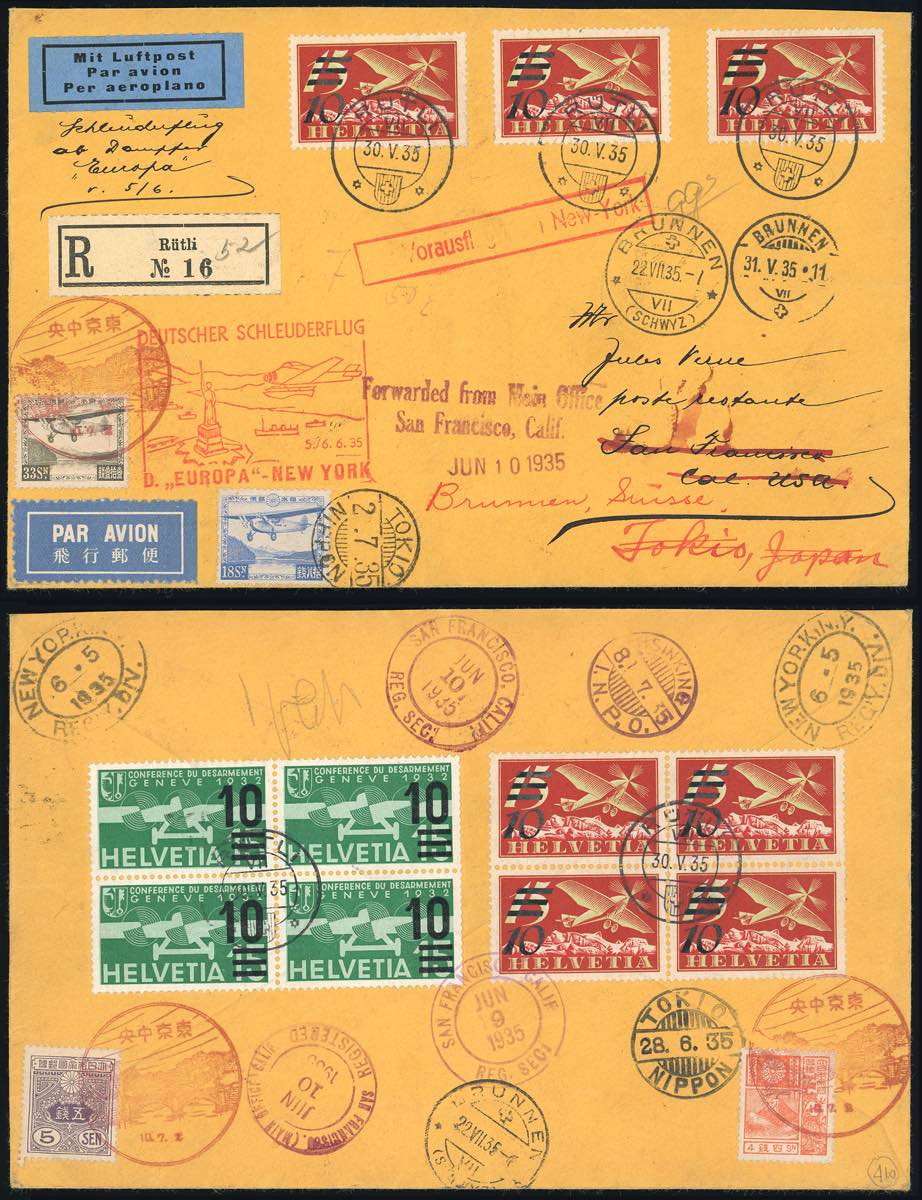 SVIZZERA POSTA AEREA 1935 - Aerogramma raccomandata affrancata del volo catapultato dalla nave Europa a New York 5/6/1935, bollo speciale, indirizzato a San Francisco, rispedito a Tokio e, con nuova affrancatura giapponese, rispedito in Svizzera. Interessante e raro.