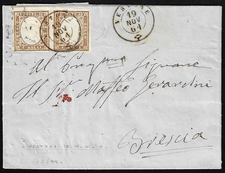 VESTONE, punti 5 - 10 cent. (Sardegna 14Cea), coppia, perfetta, su busta del 19/11/1861 per Brescia. A.Diena.