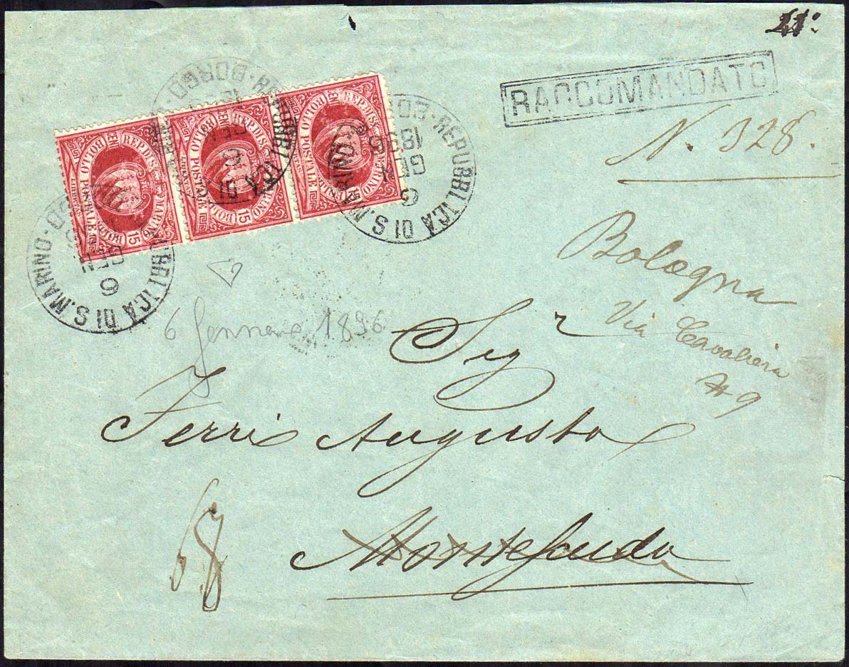 1896 - 15 cent. Stemma (15), striscia di tre, ottimo stato, su busta raccomandata del 6/1/1896 per Montescudo, rispedita a Bologna.
