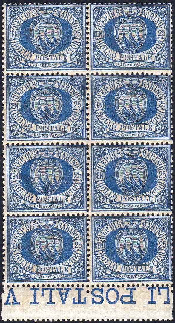 1894 - 25 cent. Stemma (30), blocco di otto, discreta centratura, bordo di foglio, gomma integra, perfetto.