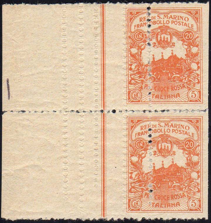 1916 - 20 + 5 cent. Croce Rossa (CEI 50B), coppia verticale non dentellata a destra e con dentellatura verticale al centro, bordo di ... Leggi tutto