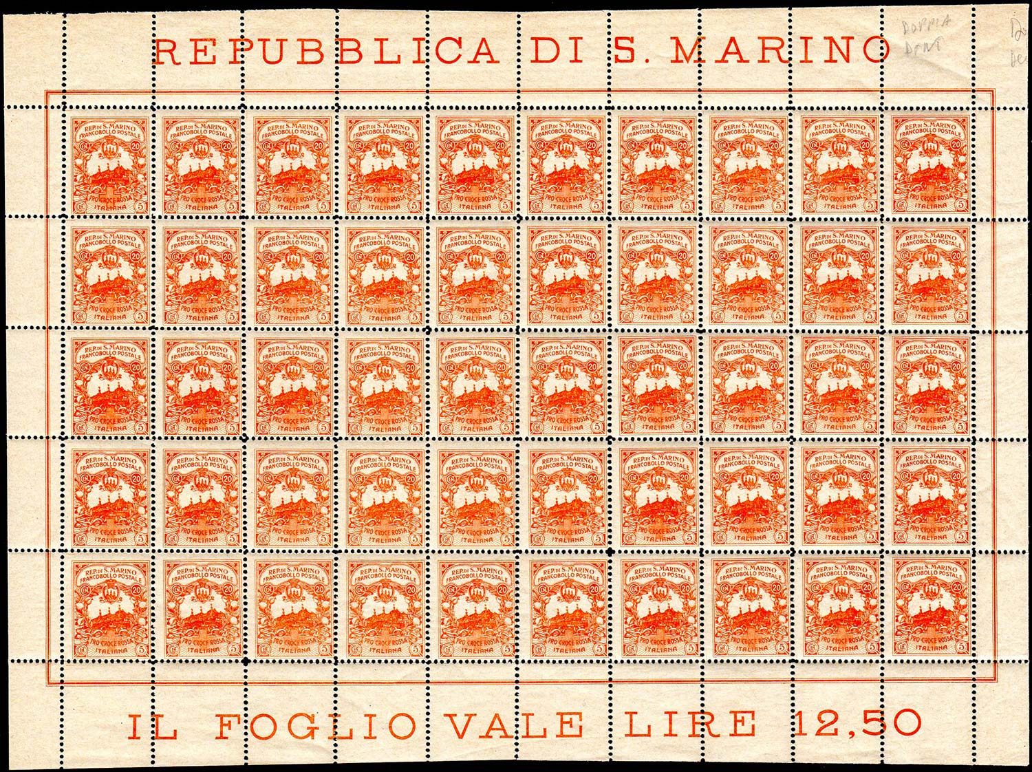 1916 - 20+5 lire Croce Rossa, non emesso, doppia dentellatura, foglio completo di 50 esemplari (CEI 50Be, € 40.000), gomma integra, ... Leggi tutto