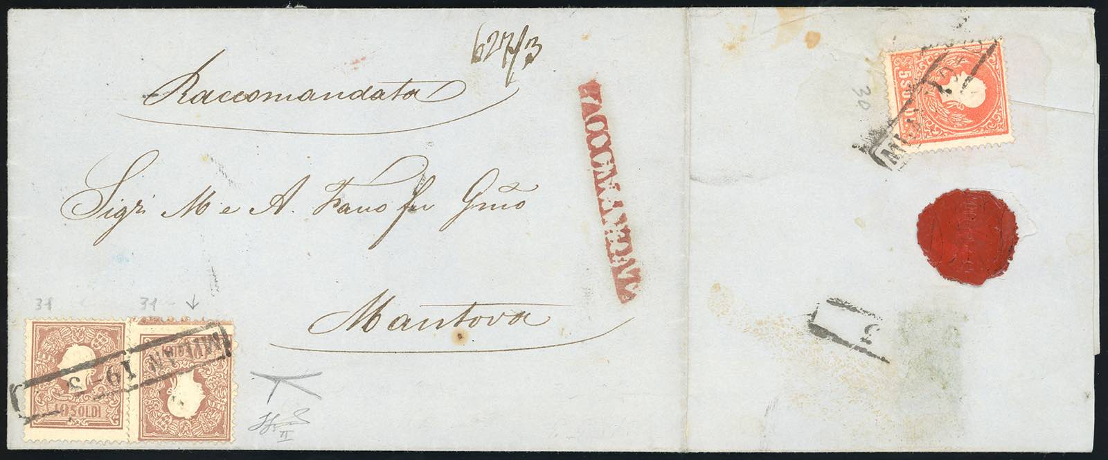 1859 - 10 soldi bruno, II tipo, due esemplari, uno con evidente principio di croce e 5 soldi, I tipo, al verso (30,31), perfetti, su fresca raccomandata da Milano 19/3/1859 a Mantova. Bella e non comune. Bottacchi, Ferrario.