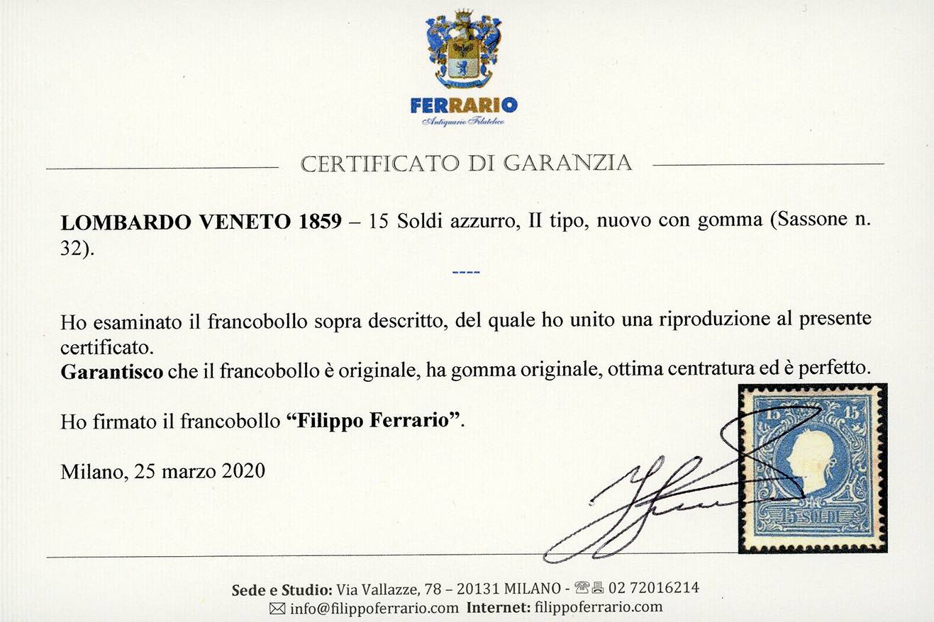1859 - 15 soldi azzurro, II tipo (32), gomma originale, perfetto e di ottima centratura. Bello e raro. A.Diena, cert. Ferrario.
