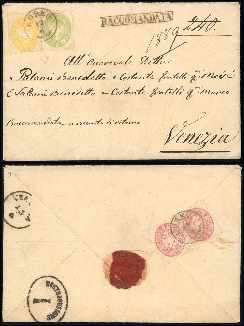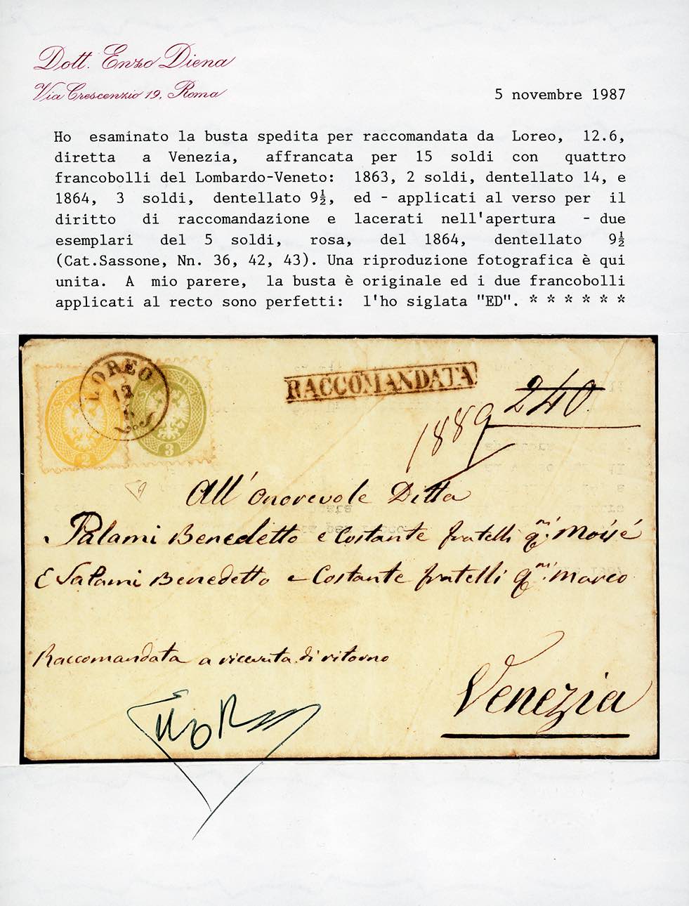 1863 - 2 soldi giallo, 3 soldi verde, perfetti, 5 soldi rosa (36,42,43), due esemplari al verso, per assolvere il diritto di raccomandazione, lacerati all'origine, su busta raccomandata da Loreo 12/6 a Venezia. Rara affrancatura tricolore! Cert. Diena.