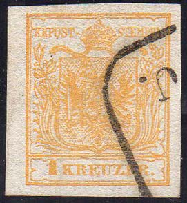 AUSTRIA 1850 - 1 k. giallo (1), usato, perfetto. Molto bello.