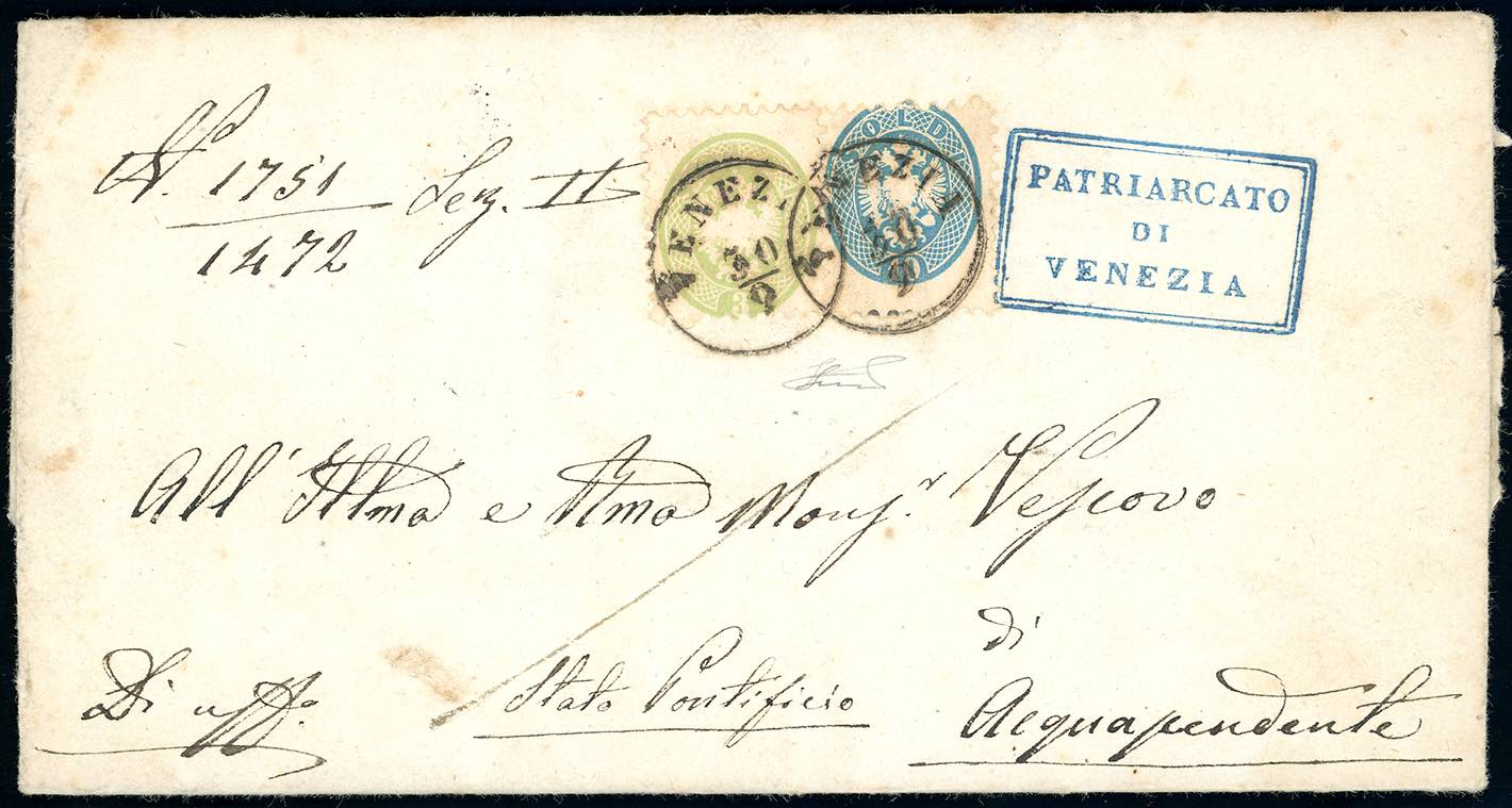 1864 - Lettera "circolare" (manoscritto all'interno), spedita non affrancata dal Patriarcato di Venezia inizialmente il 26/9/1864 ad Acquapendente, nello Stato Pontificio. In un secondo momento la lettera venne richiamata per essere affrancata con 3 soldi verde e 10 soldi azzurro, dent. 9 1/2 (42/44), e giunse a destino senza tassazioni. Interessante tariffa, insieme molto raro, da studiare. Ferrario.
