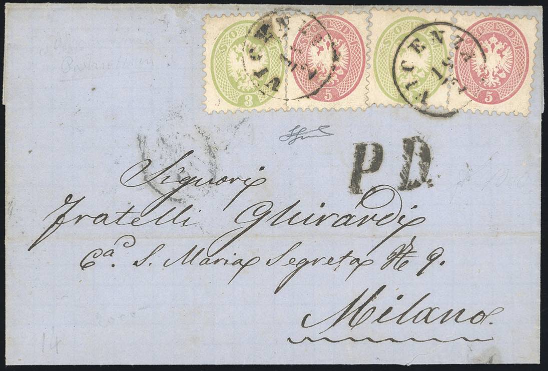 1865 - 3 soldi e 5 soldi, due esemplari, tutti dent. 9 1/2 (42,43), perfetti, su lettera da Vicenza 18/2/1865 a Milano, bollo P.D. Bella affrancatura a bandiera. Ferrario.