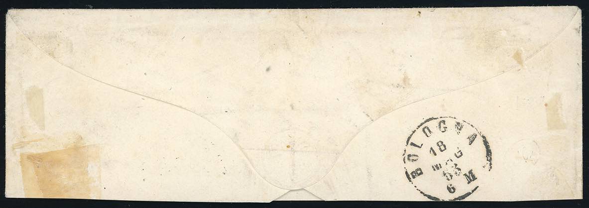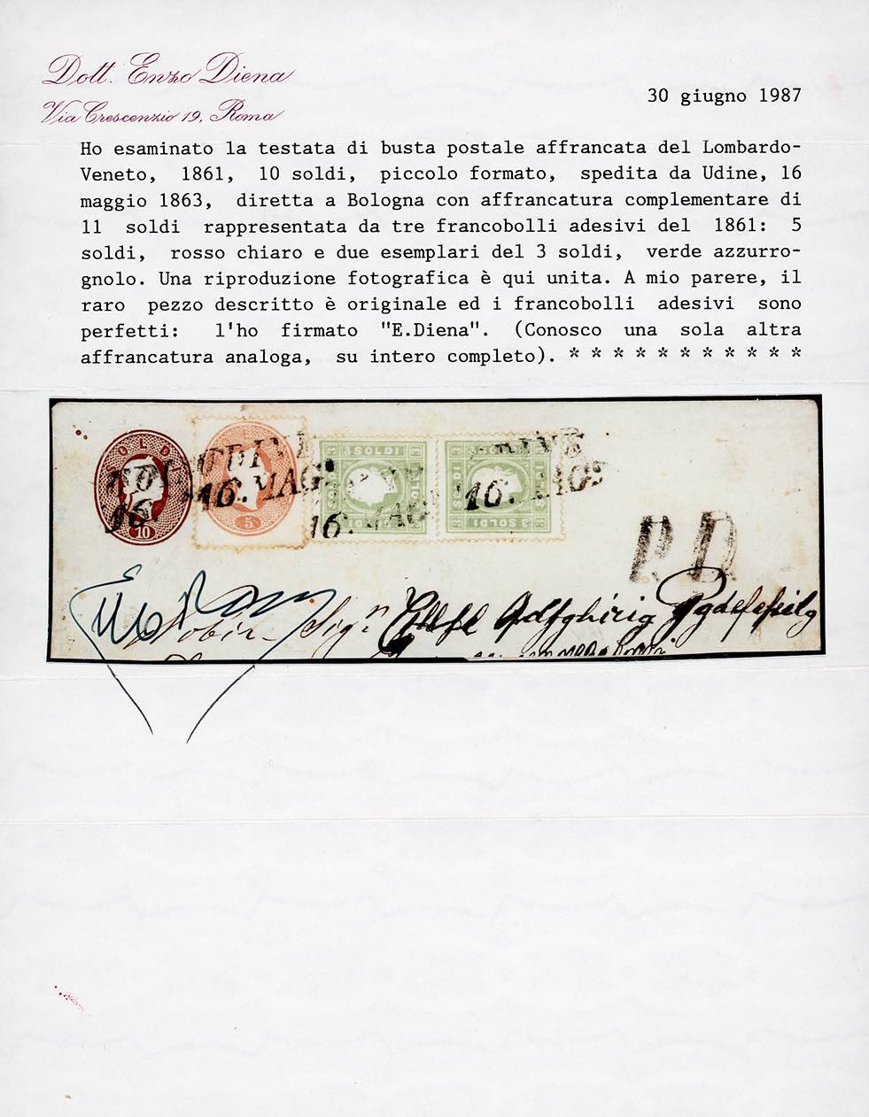 1861 - 10 soldi bruno rosso, testata di busta postale, formato piccolo (11), integrata con 5 soldi rossi chiaro e 3 soldi verde azzurrognolo, due esemplari (33a,35a), perfetti, da Udine 16/5/1863 a Bologna, bollo di arrivo al verso. Una delle due affrancature note così composte. Per specialista. Ferrario, cert. E.Diena.