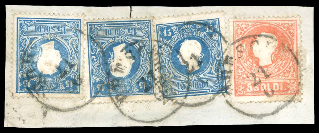 1859 - 15 soldi azzurro, II tipo, tre esemplari, 5 soldi rosso chiaro, I tipo (32,25a), perfetti ad eccezione di un esemplare da 15 soldi che presenta una lieve piega, usati su frammento a Brescia 21/6/1859. Affrancatura estremamente rara in questo periodo. Cert. Bottacchi.