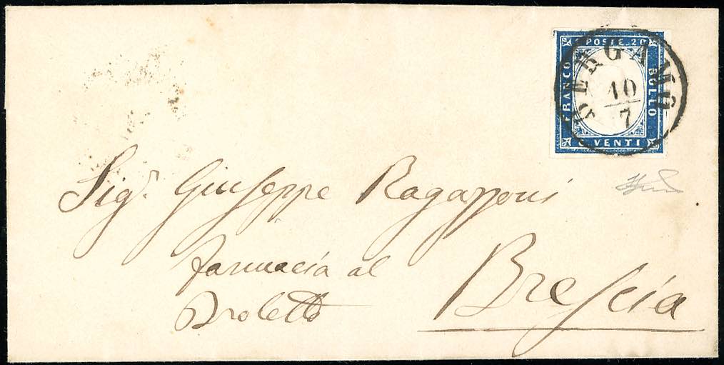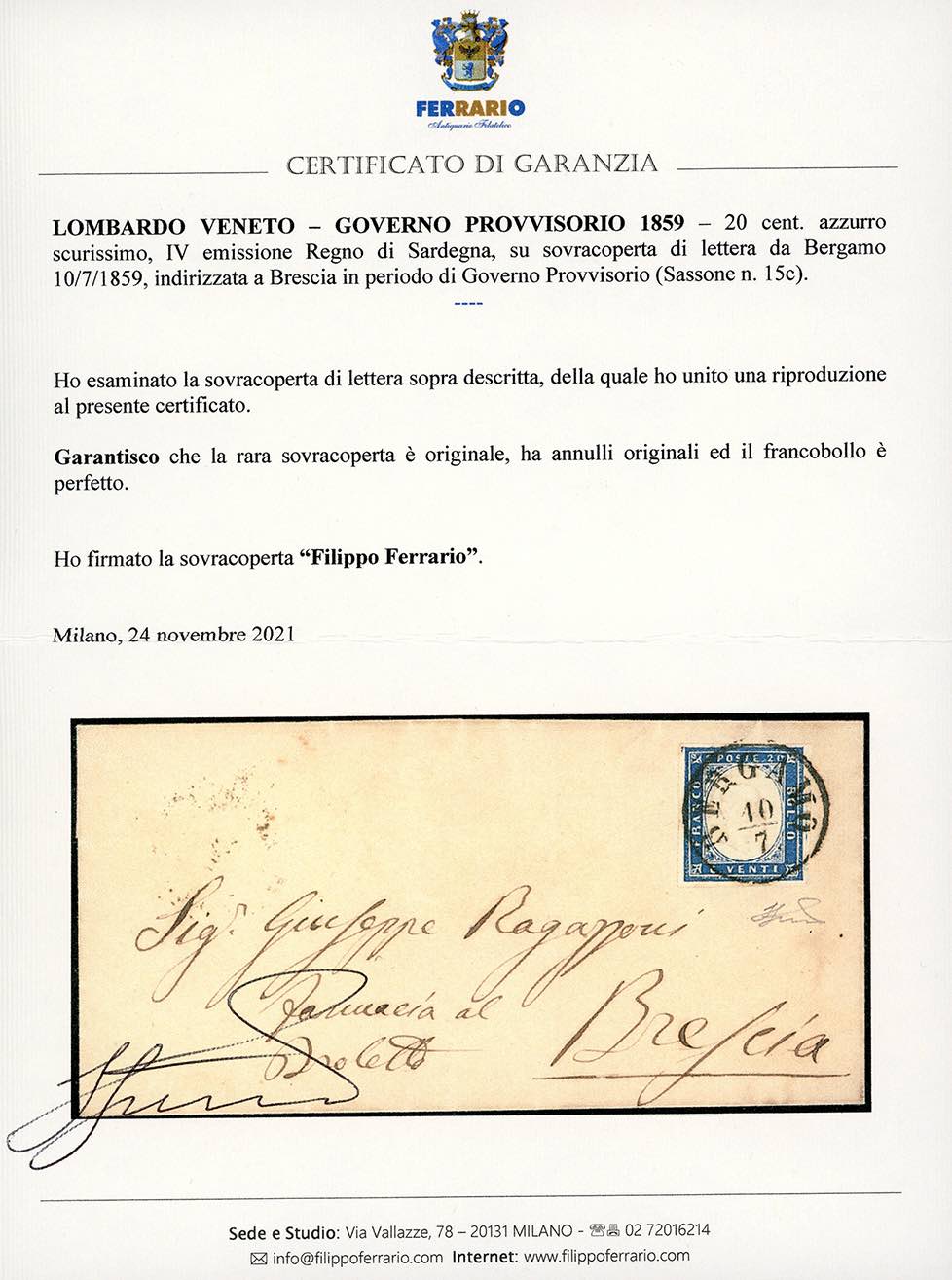 1859 - BERGAMO, C1 punti 13 - 20 cent. IV emissione di Sardegna (15C), perfetto, su sovracoperta di lettera del 10/7/1859 per Brescia, al verso 2CO. Pregevole annullo in periodo di Governo Provvisorio. Bellissima. Cert. Ferrario.