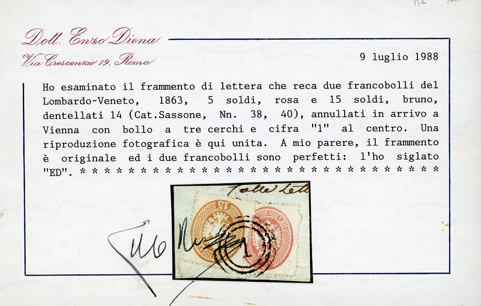 VIENNA (AUSTRIA), tre cerchi con cifra 1 al centro punti R2 - 5 s. rosa e 15 s. bruno, dent. 14 (38,40), perfetti, usati su frammento. Bello e molto raro! G.Oliva, Ferrario, cert. E.Diena.