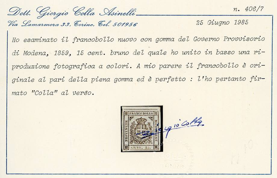 1859 - 15 cent. bruno (13), nuovo, gomma originale, perfetto. Molto fresco, ottimi margini. G.Oliva, Ferrario, cert. Colla.