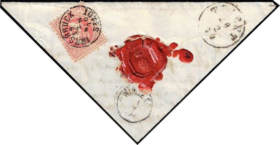 AUSTRIA 1870 - 5 kr. Francesco Giuseppe (34), lacerato all'apertura, al verso di lettera triangolare da Innsbruck 19/2/1870 a Primiero. Raro uso al verso contro il regolamento postale.