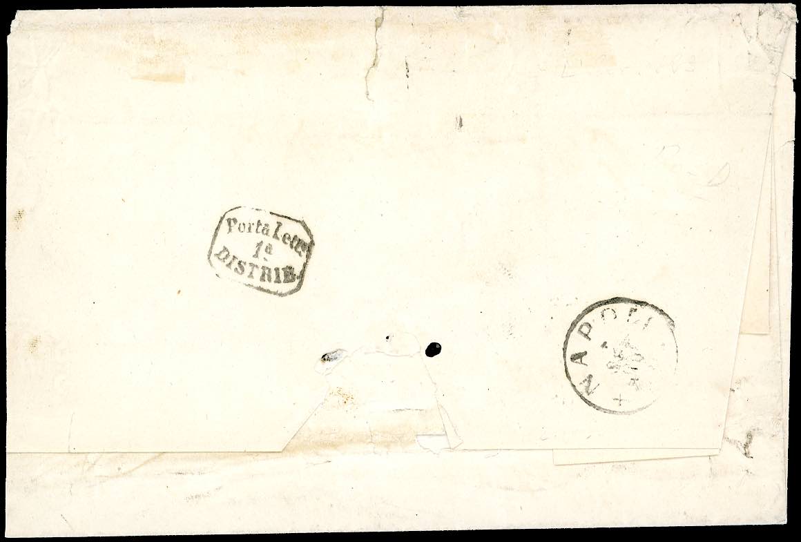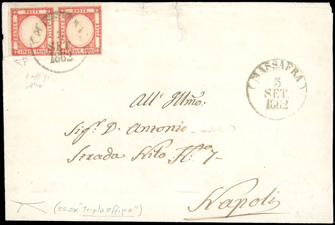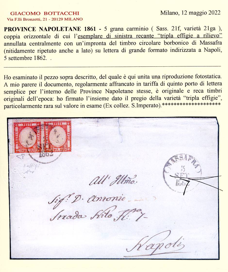 1862 - 5 grana carminio, coppia orizzontale, il primo esemplare con TRIPLA EFFIGIE (21f/ga), buono stato, su fresca sovracoperta di lettera da Massafra 5/9/1862 a Napoli. UNICO ESEMPLARE FINORA NOTO SU LETTERA, si conosce solo un altro esemplare su frammento. Per specialista. E.Diena, Chiavarello, cert. Bottacchi. Ex coll. Imperato.