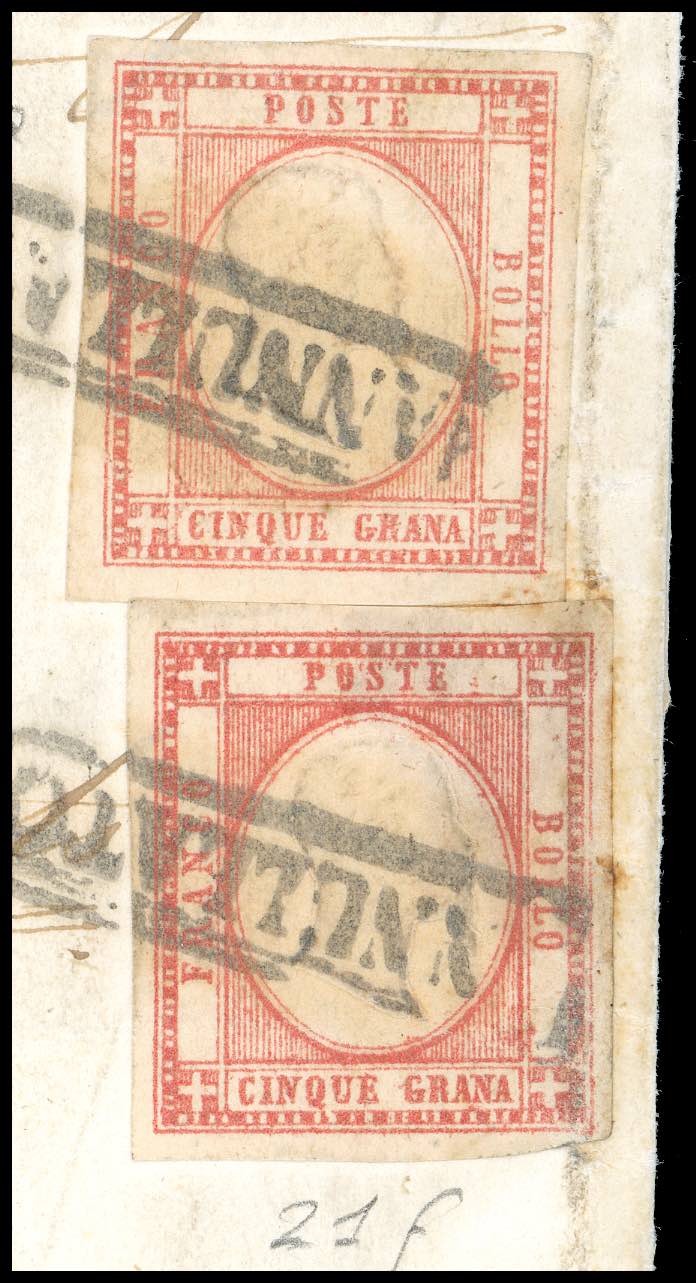 1861 - 20 grana bistro olivastro, 20 grana arancio, gradazione scura tendente all'ocra, 5 grana vermiglio, 5 grana carminio (23ba,23b,21a,21f), su lettera di doppio porto da Napoli 16/2/1861, terzo giorno d'uso a Bordeaux, Francia. Dalla lettera venne probabilmente asportato un ulteriore francobollo da 20 grana, probabilmente sottratto in quanto sfuggito all'annullamento. INSIEME UNICO per l'eccezionale combinazione di doppi valori gemelli, impreziosito dalla rara gradazione del 20 grana olivastro. E.Diena, Chiavarello, cert. Bottacchi. Ex coll. Imperato.