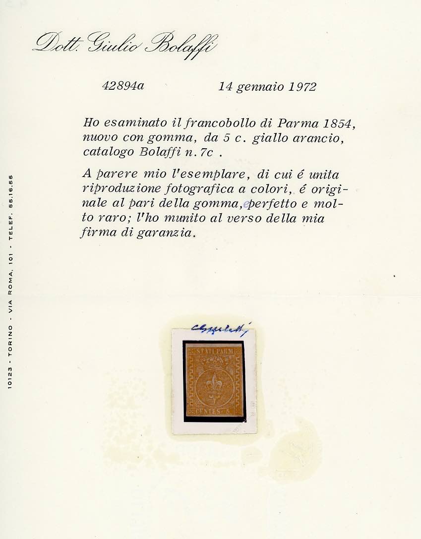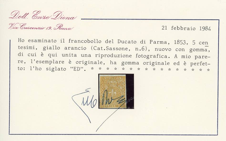 1853 - 5 cent. giallo arancio (6), gomma originale, perfetto. Ampi margini e grande freschezza. Rarità. Emilio ed A. Diena, Cert. G. Bolaffi ed E. Diena.