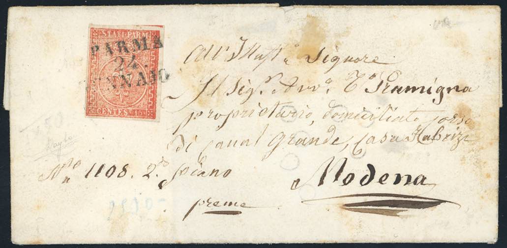 1855 - 15 cent. vermiglio (7), spazio tipografico in alto, perfetto, su sovracoperta di lettera da Parma 24/1/1855 a Modena. Interessante. ... Leggi tutto