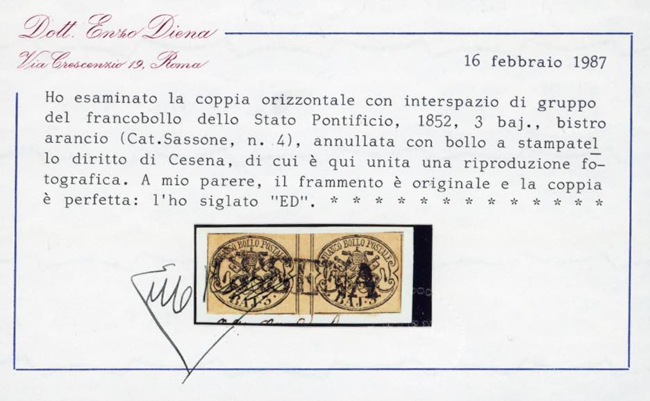 1852 - 3 baj bistro arancio (4), coppia orizzontale con interspazio di gruppo, perfetta, usata su piccolo frammento a Cesena. Bella! Cert. Diena.