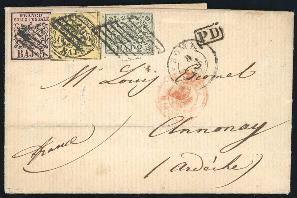 1867 - 3 baj giallo cromo, margine sinistro a filo, 2 baj grigio azzurrastro, 5 baj rosa carminio, perfetti (4A,3Ab,6A), su lettera da Roma 9/2/1867 per la Francia. Non comune affrancatura tricolore.