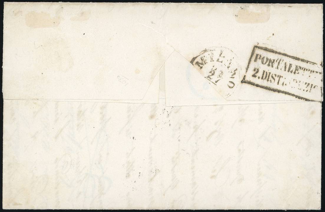 1855 - 8 baj bianco, falso per posta di Bologna, I tipo, otto filetti (F4), perfetto, su lettera da Bologna 26/6/1855 a Milano. Splendida e ... Leggi tutto