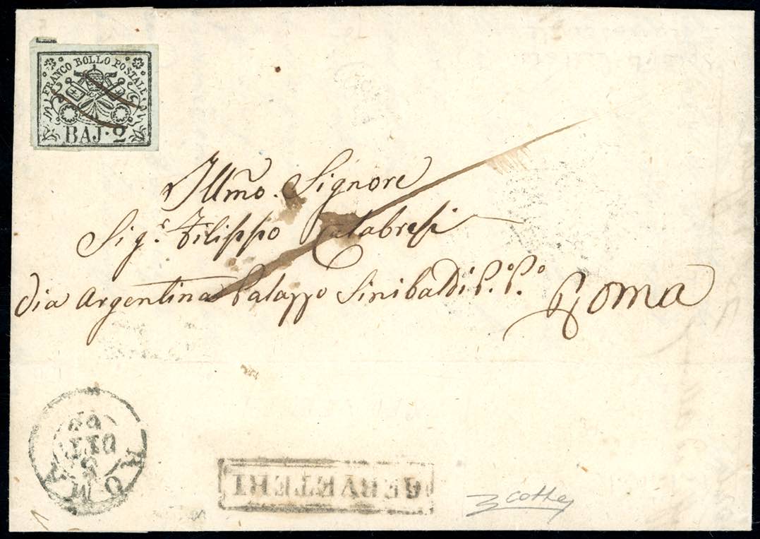 CERVETERI, punti R2 - 2 baj (3Ab), perfetto, su lettera del 4/10/1865 per Roma, francobollo annullato con tratti di penna. Molto raro e di ottima qualità. Cert. Colla.