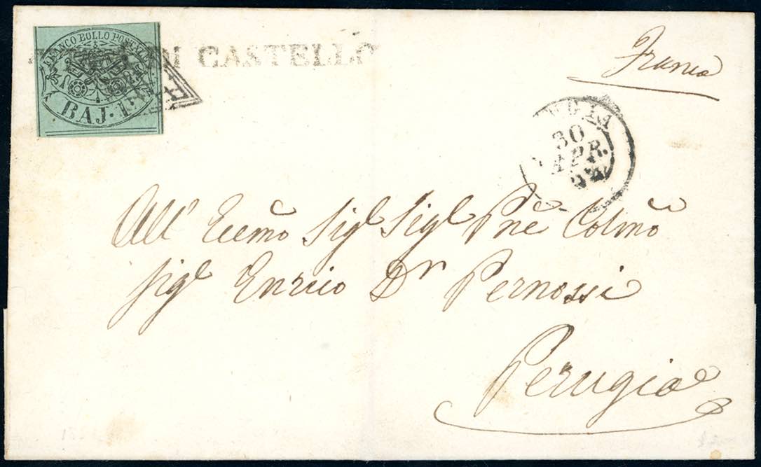 CITTA' DI CASTELLO, punti 10 - 1 baj (2), perfetto, su sovracoperta di lettera per Perugia 30/4/1852. Il francobollo è stato annullato ... Leggi tutto