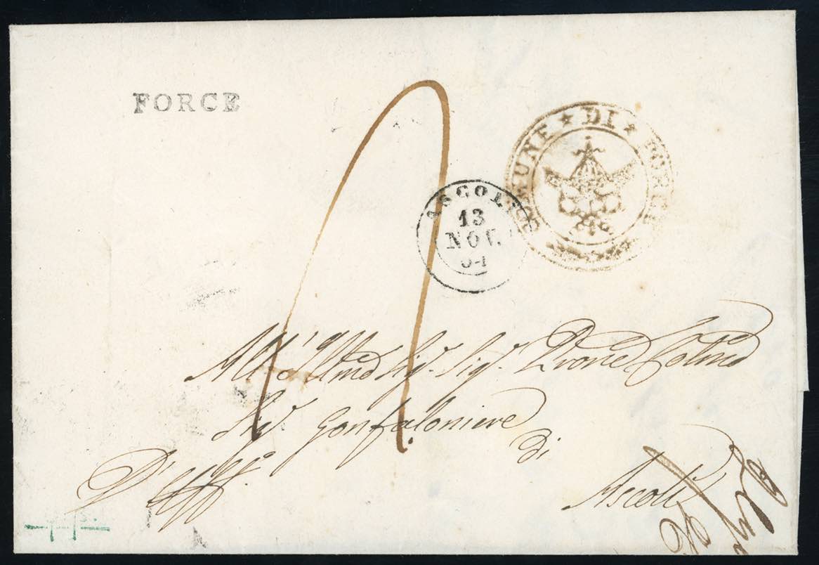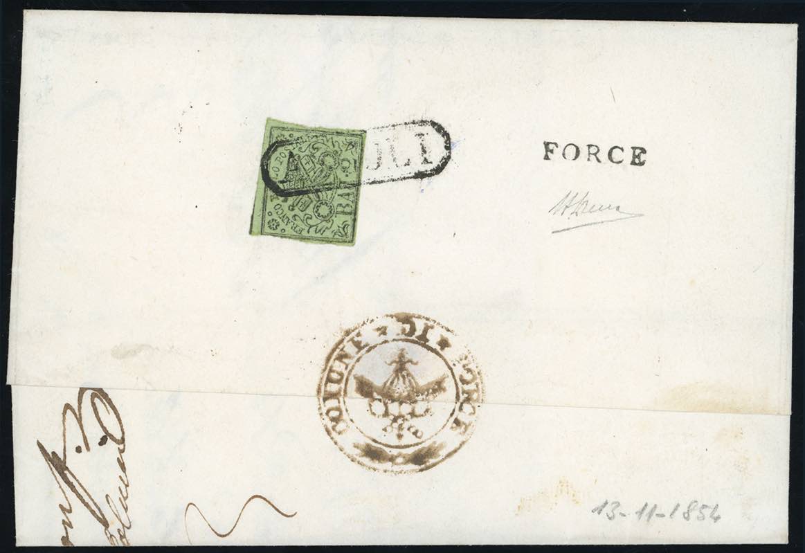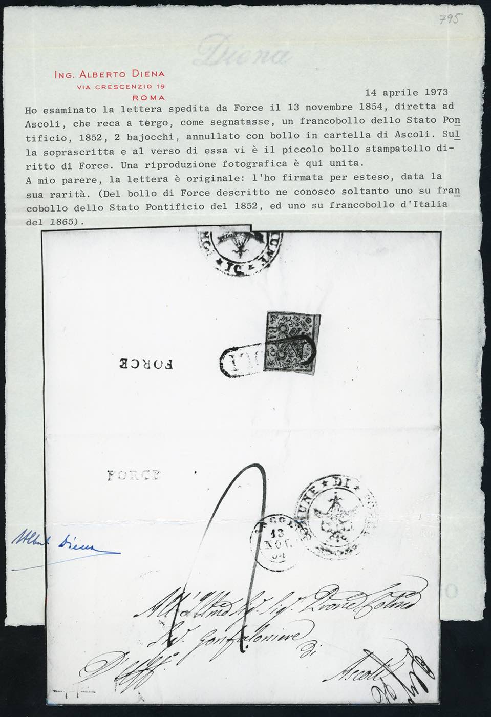 FORCE, punti R2 - 2 baj (3b), leggermente intaccato a sinistra, al verso di sovracoperta di lettera in porto assegnato per Ascoli 13/11/1854, tassata 2 baj, un'impronta di questo raro lineare è stato eccezionalmente apposta anche sul fronte. Di grande freschezza e con il bollo molto nitido. Per grande collezione. Cert. A.Diena.