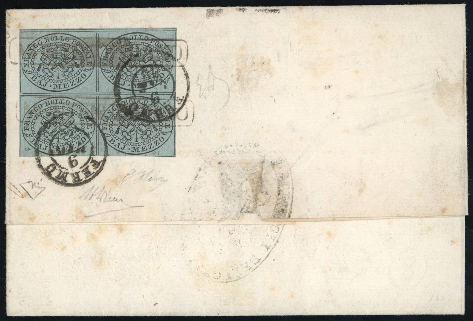 MONTERUBBIANO, cartella annullatore non catalogato - 1/2 baj (1a), blocco di quattro, perfetto, al verso di sovracoperta di lettera in porto assegnato per Mont' Appone, transito di Fermo del 9/3/1852, tassata 2 baj. Uso inedito del bollo di partenza, catalogato solo come non annullatore, e pregevole affrancatura, specie per un centro minore. Em., A. ed E.Diena, G.Oliva.