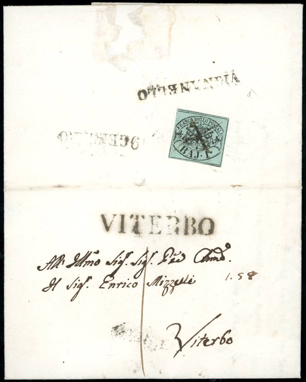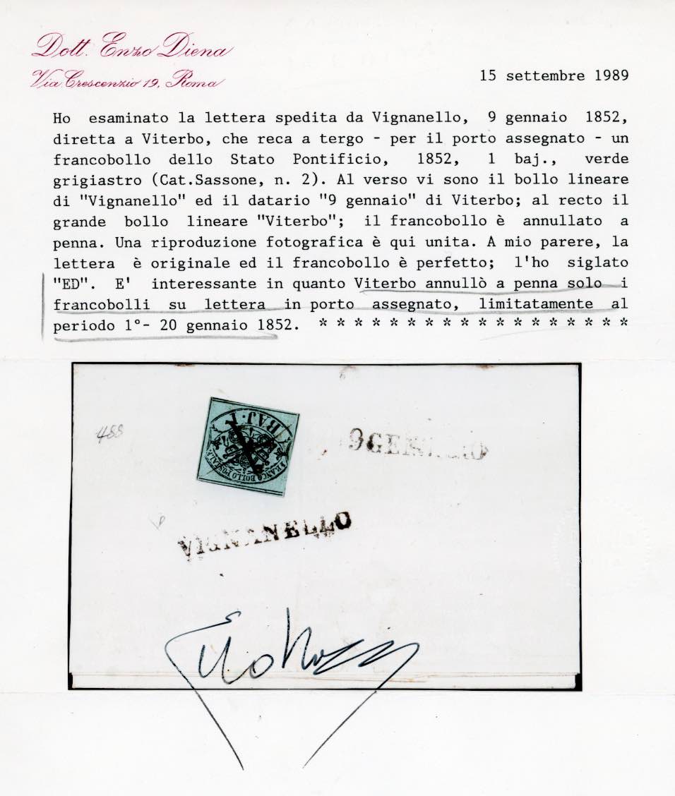 VITERBO, a penna punti 12 - 1 baj (2), perfetto, al verso di lettera in porto assegnato da Vignanello 8/1/1852, primissimi giorni d'uso, a Viterbo, tassata 1 baj. Viterbo annullò a penna i francobolli su lettere in porto assegnato solo dal 1° al 20 gennaio 1852. Interessante! Dettagliato cert. Diena.