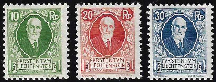 LIECHTENSTEIN 1925 - Compleanno Principe Giovanni (72/74), gomma integra, perfetti. MNH.