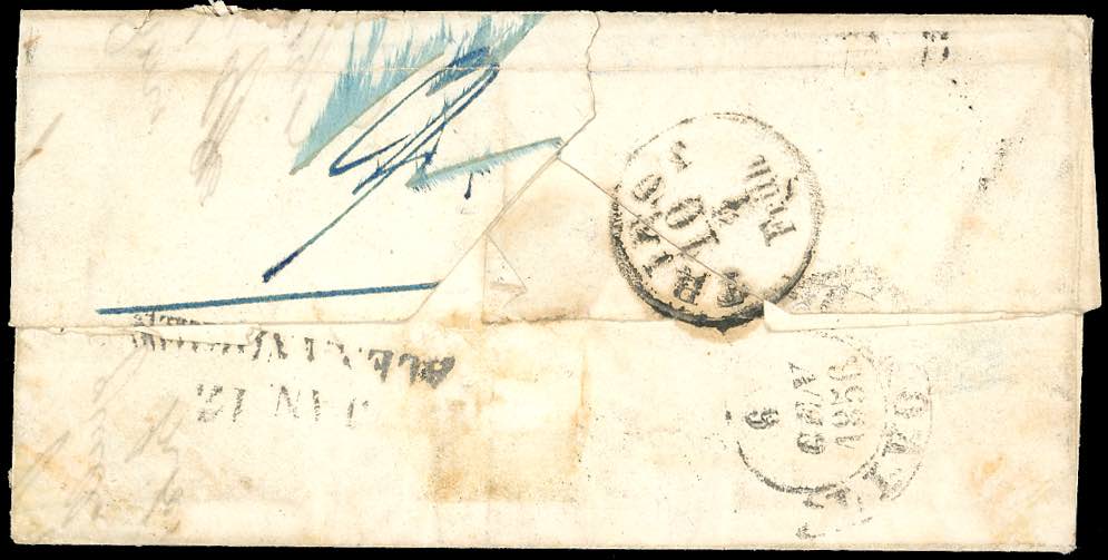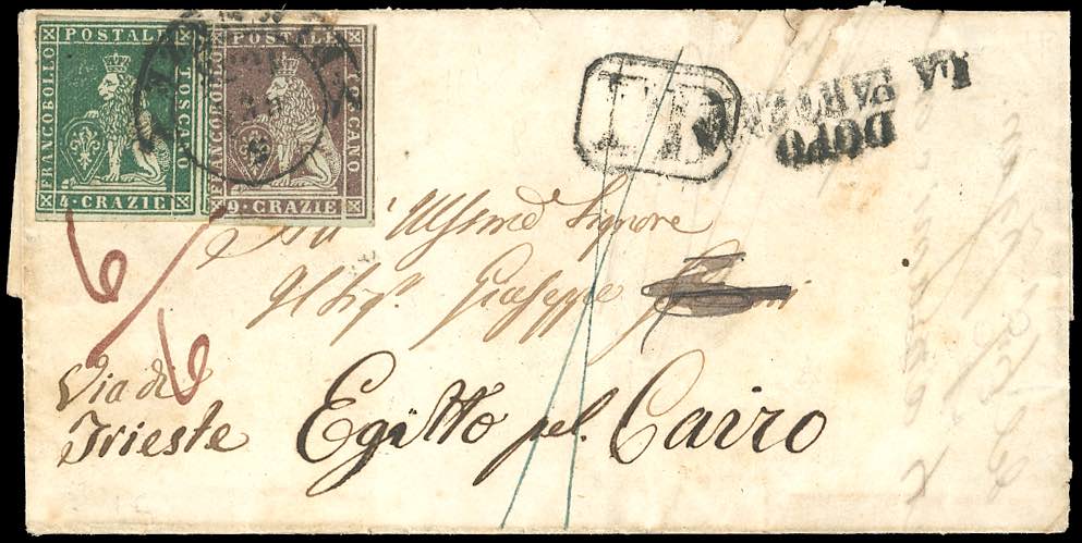 1853 - 4 crazie verde su grigio, 9 crazie bruno violaceo su grigio (6,8), difetti di marginatura, su sovracoperta di lettera da Firenze 3/1/1853 a Il Cairo in Egitto, per la via di Trieste attraverso l'ufficio austriaco di Alessandria d'Egitto. Interessante e rara destinazione.