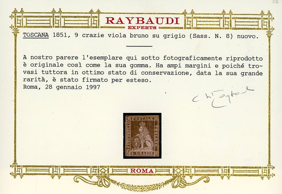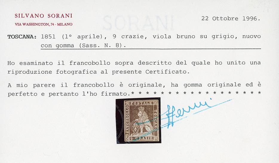 1851 - 9 crazie viola bruno e grigio (8), nuovo, gomma originale, lieve traccia di linguella, perfetto. Molto fresco con ampi margini. Estremamente raro di questa qualità. Cert. Oro Raybaudi e Sorani.