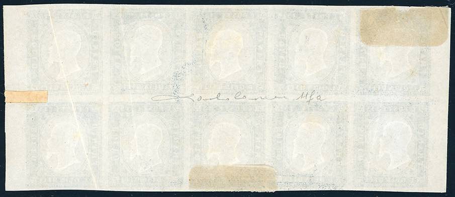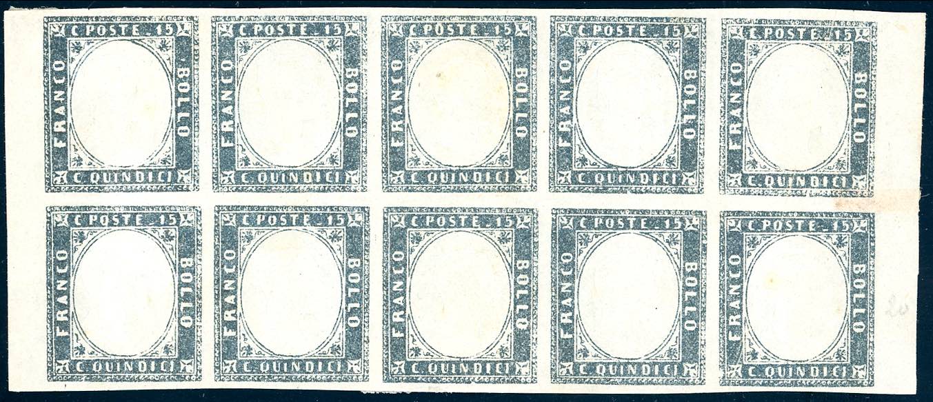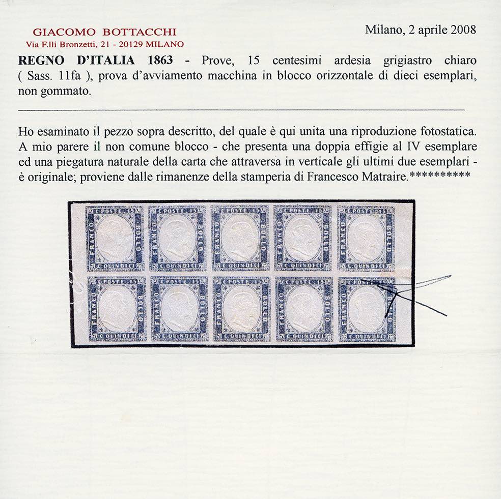 1863 - 15 cent. ardesia grigiastro chiaro (11fa), prova di avviamento macchina, blocco di dieci, bordo di foglio, doppia effigie sul quarto esemplare, senza gomma come sempre, perfetto, piega naturale di carta che attraversa gli ultimi due esemplari. Insieme rarissimo, pochi esemplari esistenti. Cardillo, cert. Bottacchi.