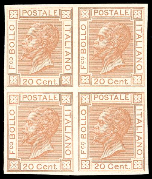 1877 - 20 cent. ocra arancio, prova d'archivio, non dentellata (P28), blocco di quattro, senza gomma, lieve grinza sugli esemplari superiori. Molto fresco. Ferrario.