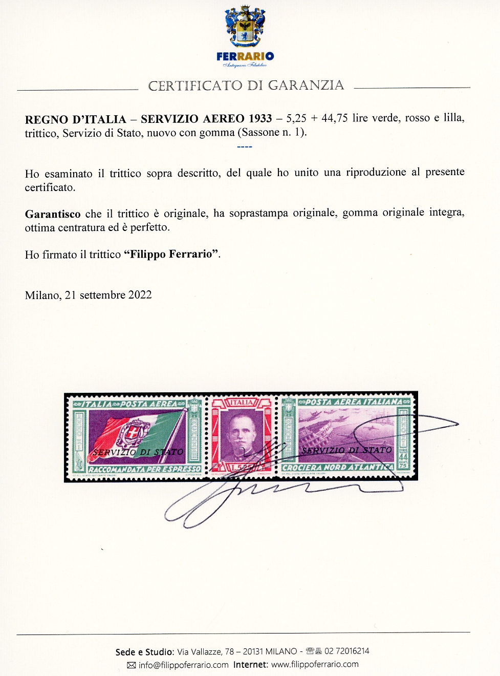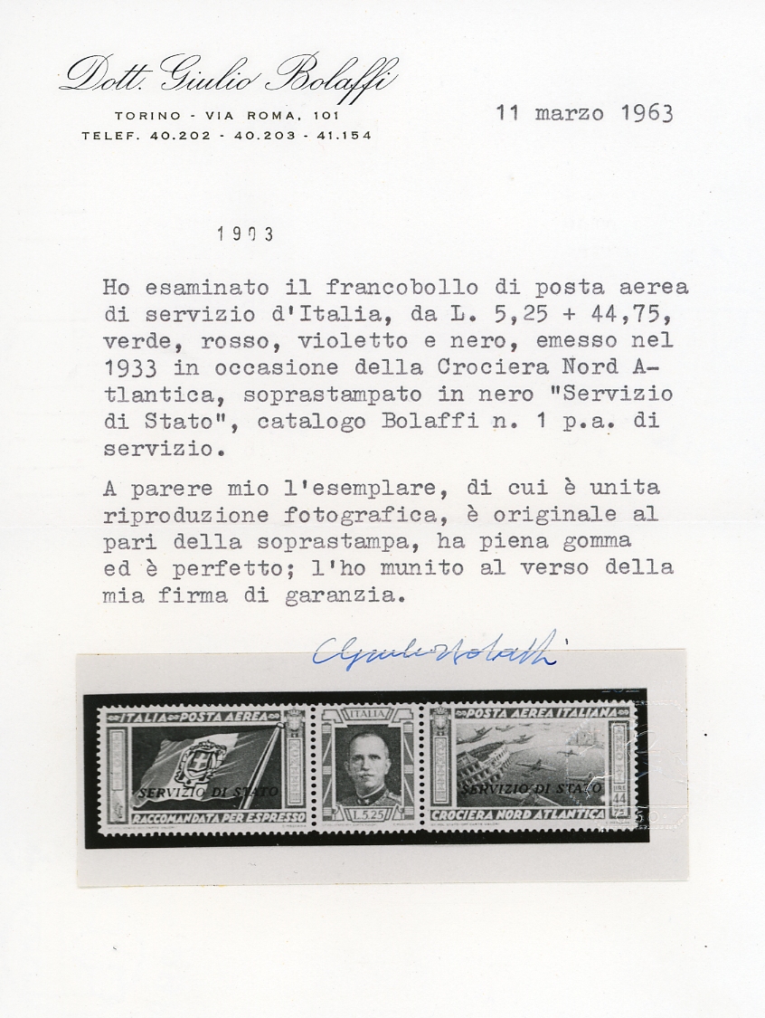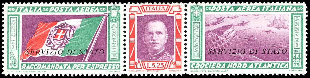 1933 - 5,25 + 44,75 lire Trittico Servizio di Stato (1), nuovo, gomma originale integra, perfetto e ben centrato. Molto fresco. Cert. Giulio Bolaffi e Ferrario.