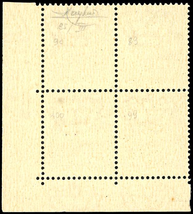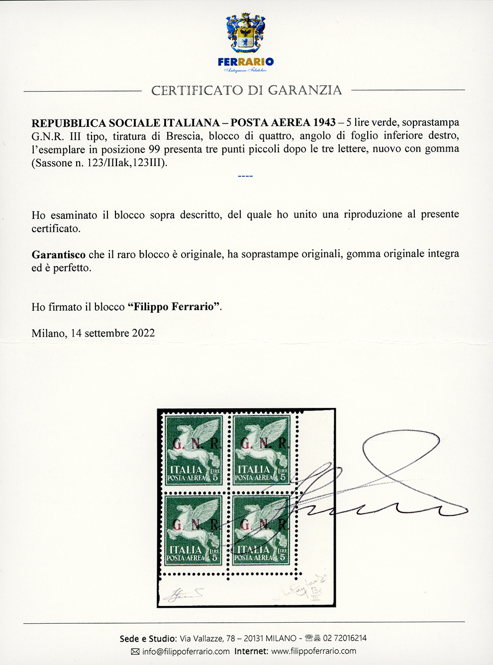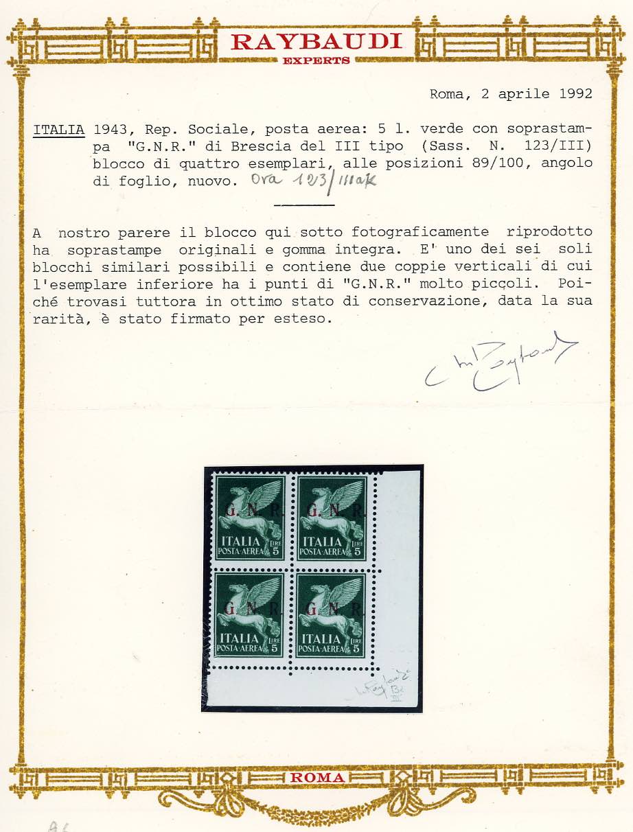 1943 - 5 lire soprastampa G.N.R. di Brescia, III tipo, blocco di quattro, l'esemplare in pos. 99 con punti piccoli dopo le tre lettere (123/IIIak,123/III), angolo di foglio, gomma originale integra, perfetto. Molto raro. Cert. Oro Raybaudi e Ferrario.