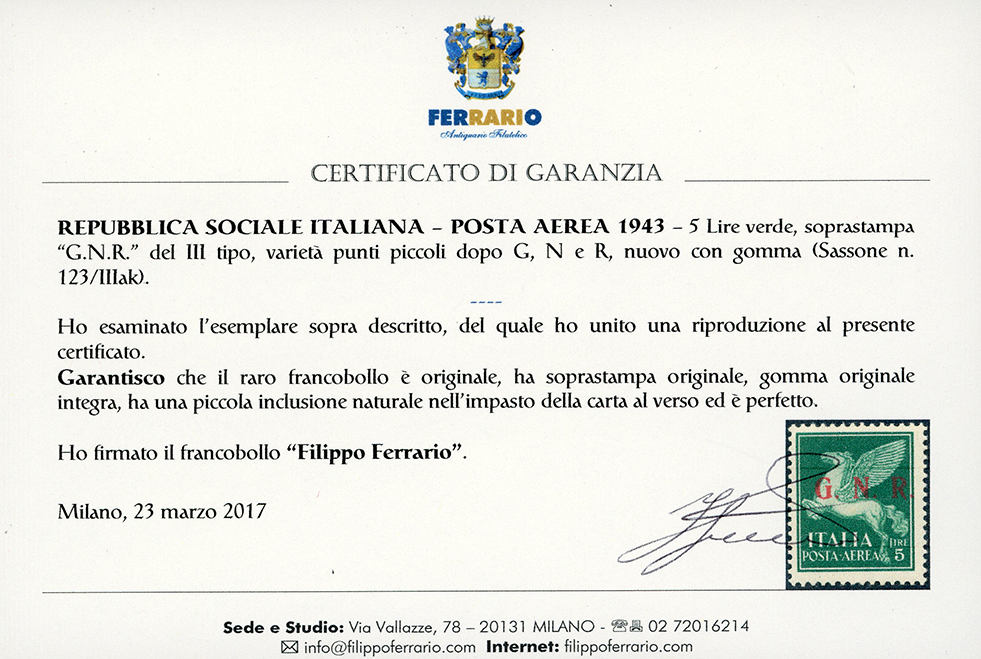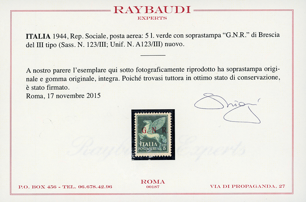 1943 - 5 lire verde, soprastampa G.N.R. di Brescia, III tipo, varietà punti piccoli dopo G., N. e R. (123/IIIak), nuovo, gomma originale integra, perfetto. Piccola inclusione naturale nell'impasto della carta al verso. Molto fresco e raro! Fiecchi, cert. Raybaudi e Ferrario.