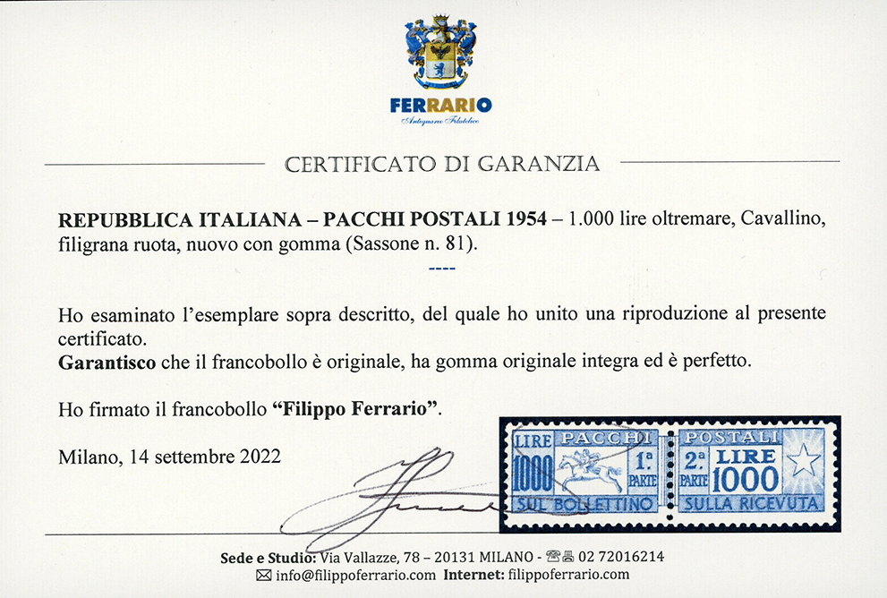 1954 - 1.000 lire Cavallino, filigrana ruota (81), gomma originale integra, perfetto. A.Diena, cert. Ferrario.