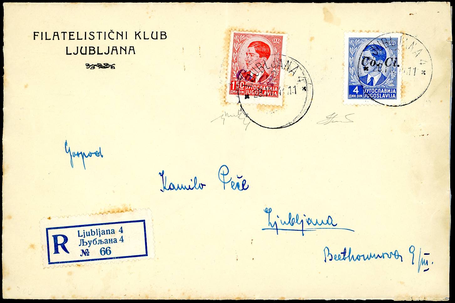 LUBIANA 1941 - 1,50 d. soprastampa a mano obliqua "Co.Ci" in violetto, 4 d. soprastampa a macchina (4Bb,7), lievi ossidazioni, su busta raccomandata da Lubiana 29/4/1941 per città. Chiavarello, Ferrario.