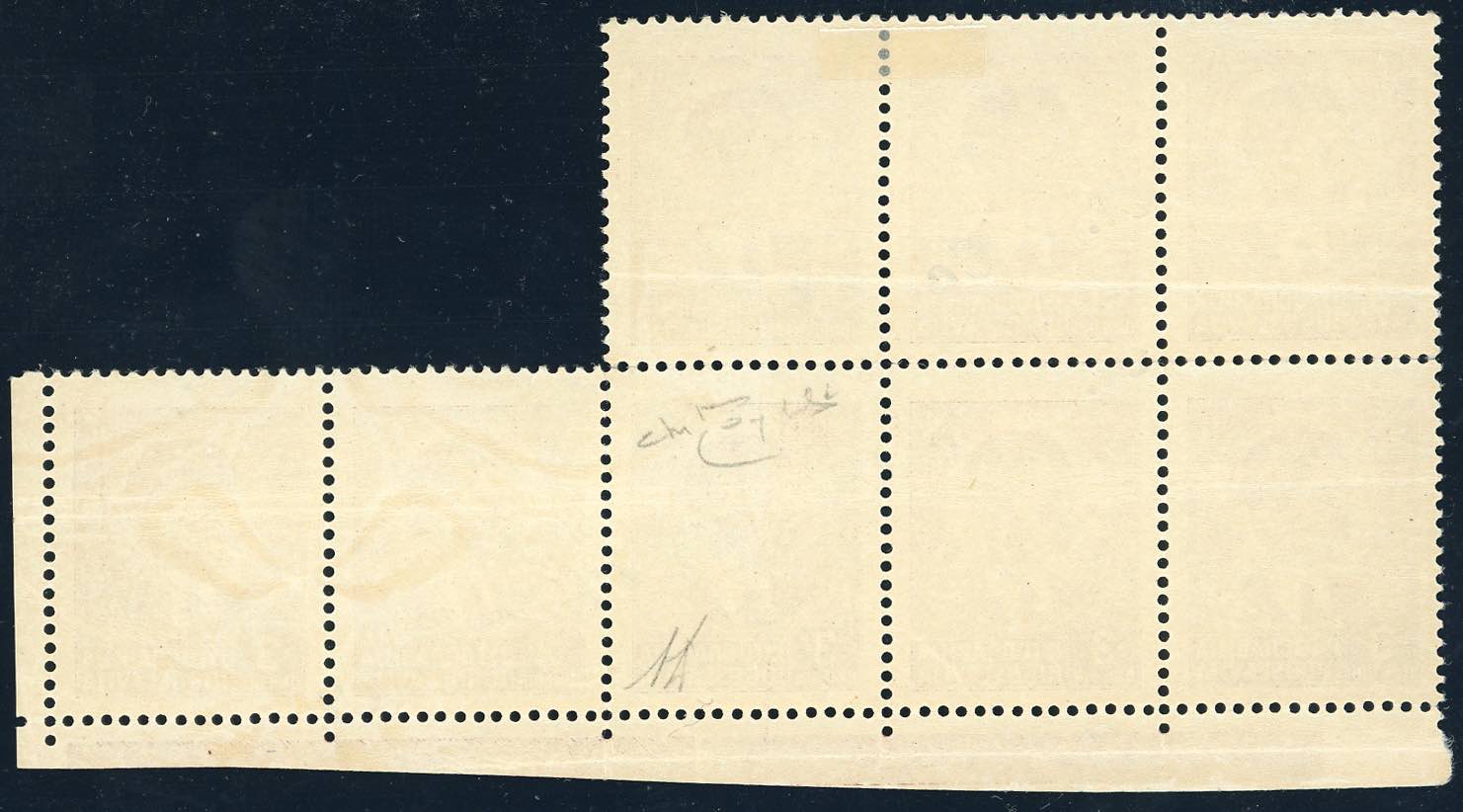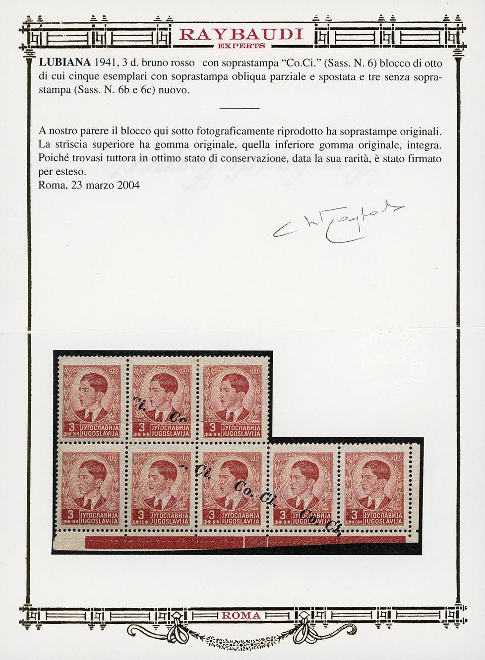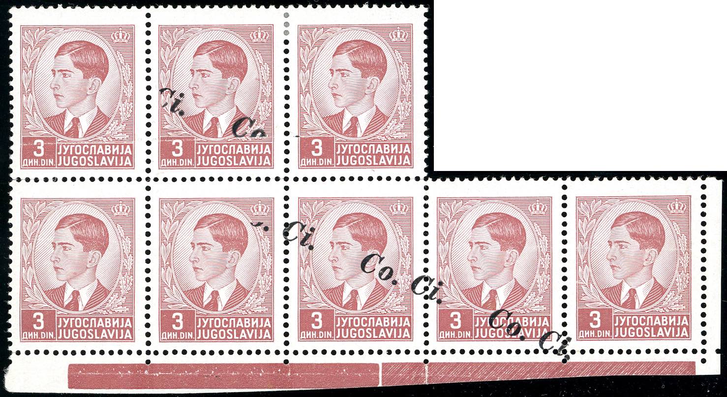 LUBIANA 1941 - 3 d. soprastampato Co.Ci., blocco di otto esemplari, cinque con soprastampa obliqua e spostata, tre senza soprastampa (6c,6b), bordo di foglio, gomma originale integra, ottimo stato. Molto raro. A.Diena, cert. Oro Raybaudi.