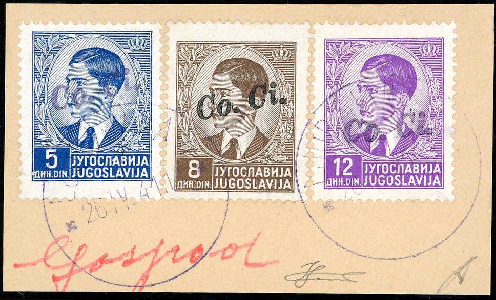 LUBIANA 1941 - Soprastampati a mano "Co.Ci.", 5 d. e 12 d. in violetto, 8 d. in nero, tutti con soprastampa obliqua (8Bb,11Bb,12Bb), perfetti, usati su frammento a Lubiana 26/4/1941, primo giorno d'emissione. Ferrario.