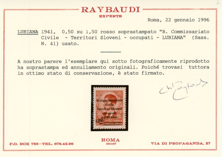 LUBIANA 1941 - 0,50 d. su 1,50 d. soprastampato "R. Commissariato" (41), usato, perfetto. Bello e raro. Fiecchi, cert. Raybaudi.