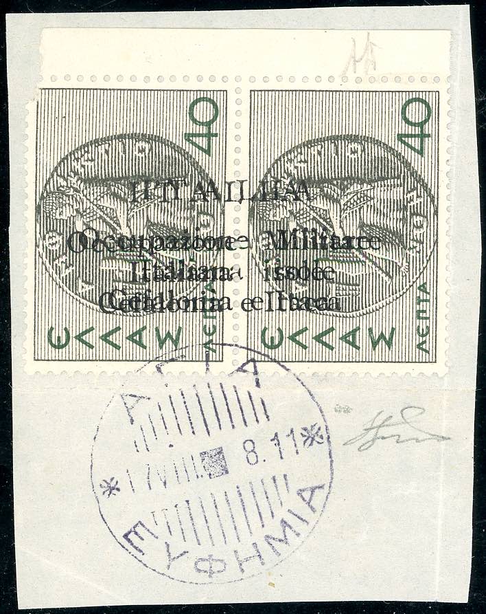 EMISSIONI DI ARGOSTOLI 1941 - 40 l. + 40 l. Mitologica, doppia soprastampa (14f), bordo di foglio, perfetto, usato su frammento. A.Diena, Ferrario.