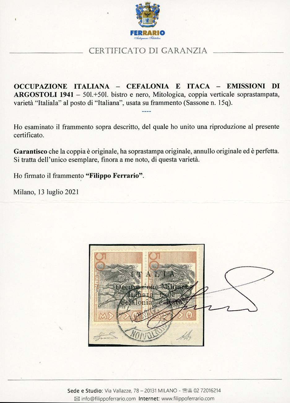 EMISSIONI DI ARGOSTOLI 1941 - 50 l. + 50 l. Mitologica, varietà "ITALIAIA" al posto di "ITALIANA" (15q), usata, perfetto. Si tratta probabilmente dell'UNICO ESEMPLARE NOTO di questa varietà. A.Diena, cert. Ferrario.