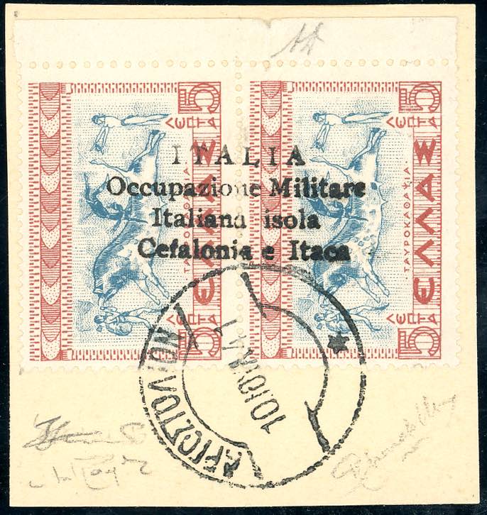 EMISSIONI DI ARGOSTOLI 1941 - 5 l. + 5 l. Mitologica, soprastampa a mano verticale su coppia verticale (56b), perfetta, usata su piccolo frammento. Raybaudi, Mondolfo, A.Diena, cert. Ferrario.
