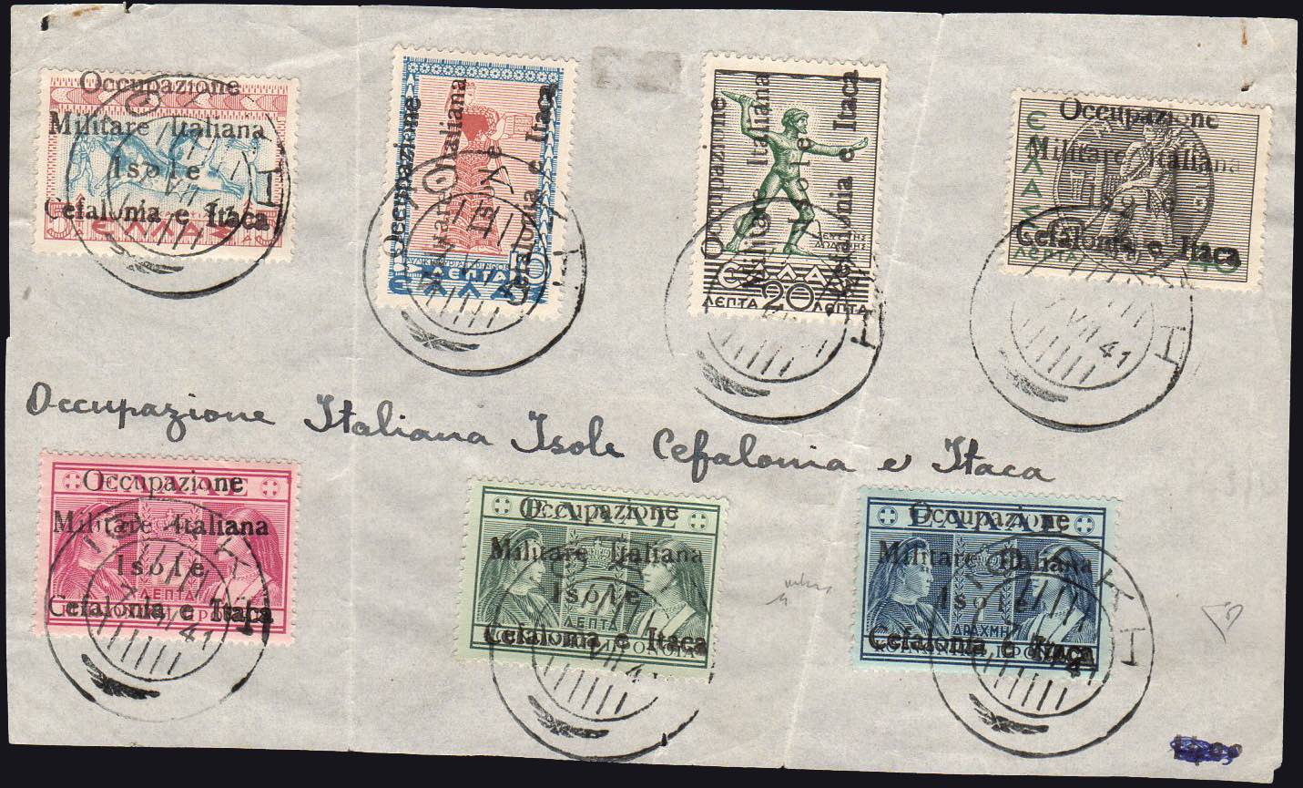 EMISSIONI DI ITACA 1941 - Mitologica soprastampati (28/31) e Previdenza Sociale (43/45), usati su ampio frammento. E.Diena, Chiavarello, Ferrario.