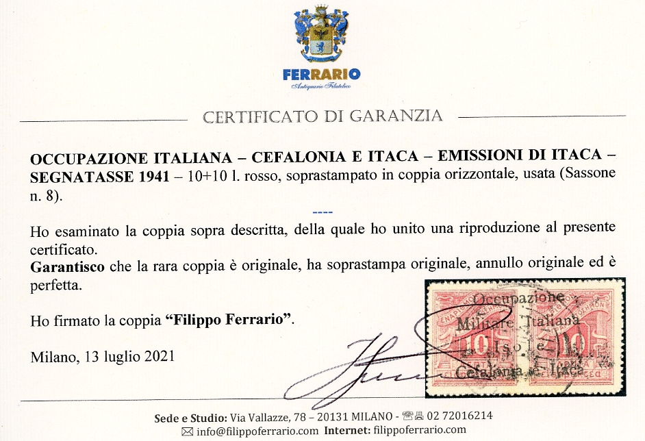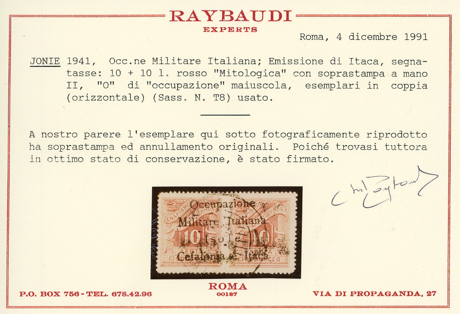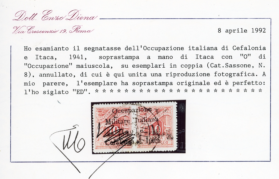EMISSIONI DI ITACA SEGNATASSE 1941 - 10 l. + 10 l. (8), usato, perfetto. Raro. Penco, cert. Raybaudi, E.Diena e Ferrario.