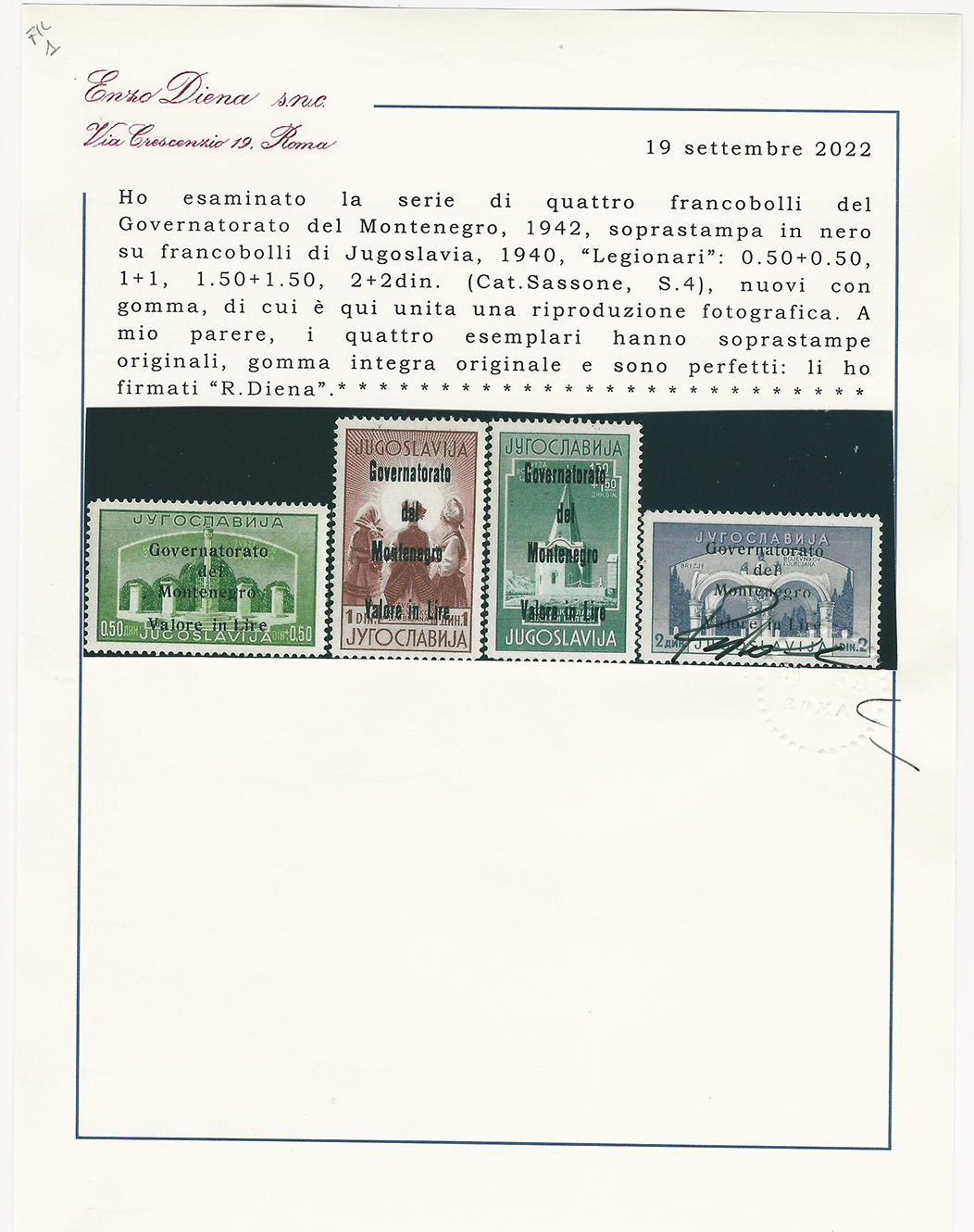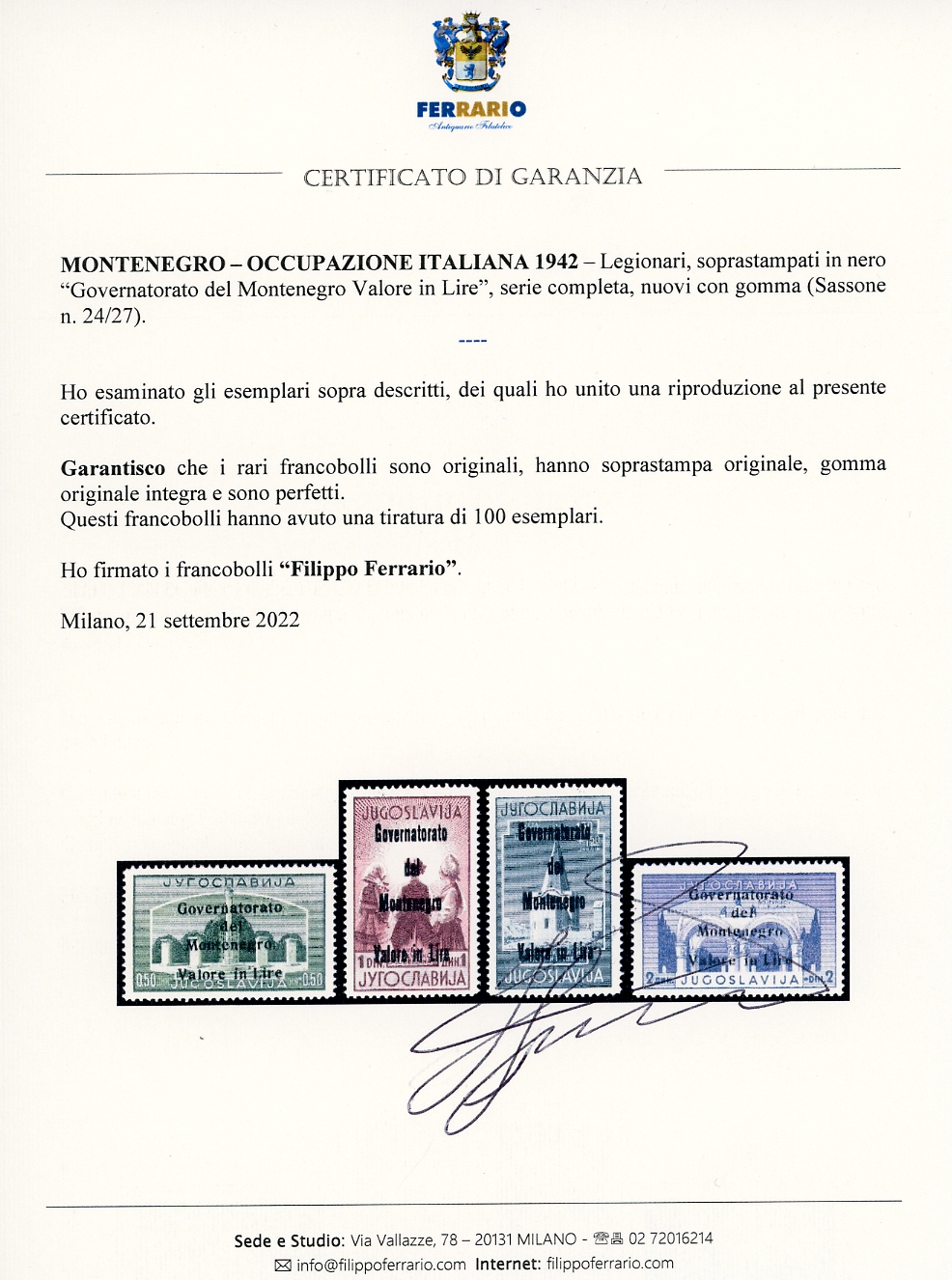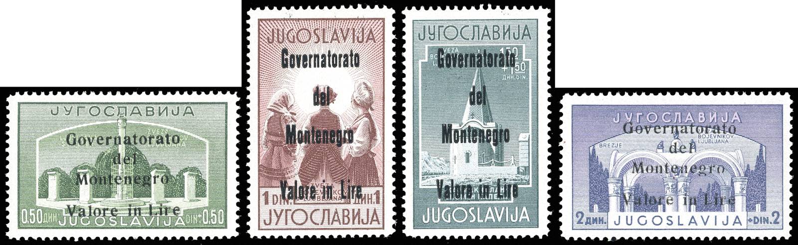 MONTENEGRO 1942 - Legionari, soprastampati in nero, serie completa (24/27), gomma originale integra, perfetti. Molto belli e rari, tiratura 100 serie di cui parecchie difettose. Cert. Ferrario e Diena.