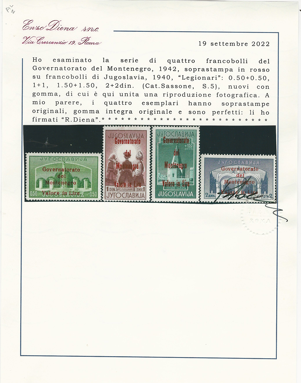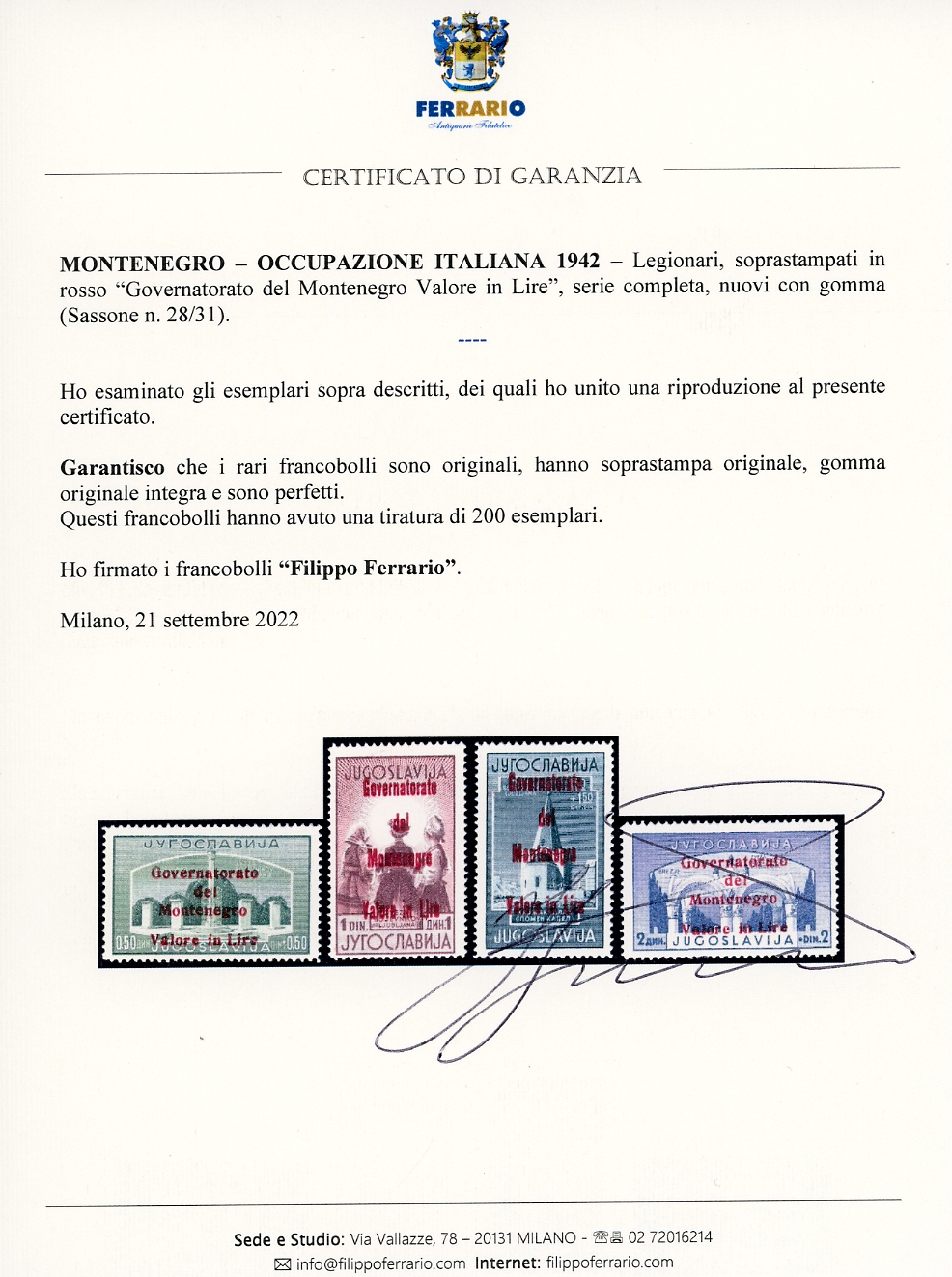 MONTENEGRO 1942 - Legionari, soprastampati in rosso, serie completa (28/31), gomma originale integra, perfetti. Rari, tiratura 200 serie di cui parecchie difettose. Cert. Diena e Ferrario.